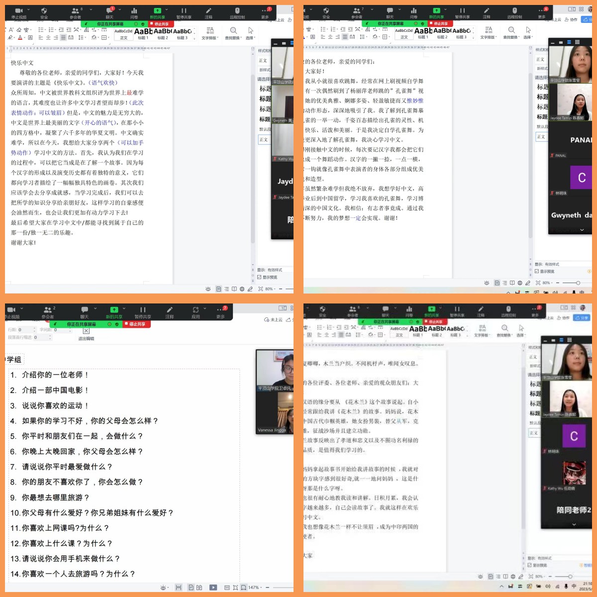 据悉,此次比赛从北京时间2023年6月15日开始,进行为期三天的比拼,共有来自印尼12个区的77位选手参加。为了比赛选手能够顺利参赛并取得优秀成绩,我院国际中文教育团队受印尼中华乐趣学苑林明珠主席所托,为来自南洋之晖学校的4位小选手进行演讲辅导。卢淑芳老师迅速成立“印尼‘汉语桥’演讲辅导”小组,成员包括2022级汉语国际教育2班张雪莹、卫卓凡。自5月27日晚上7:30开始,他们按照林明珠主席的要求,根据4位参赛选手的中文水平制定了针对性的辅导计划,对小学组的选手进行朗诵辅导,对中学组的选手进行即兴问答辅导。课堂上,两位老师帮助参赛选手修改润色演讲稿,向他们演示融入稿件演讲者思想感情的技巧。此外,两位老师还整理了常见问答题和即兴回答的技巧,带领选手模拟问答。比赛前期,来自我校旅游与规划学院的李梦洋老师、文学院2020级汉语言文学专业路艳同学也为几位选手作了大量指导。经过多次辅导,4位参赛选手无论演讲技巧的使用,还是情感的融入,都有了明显进步。