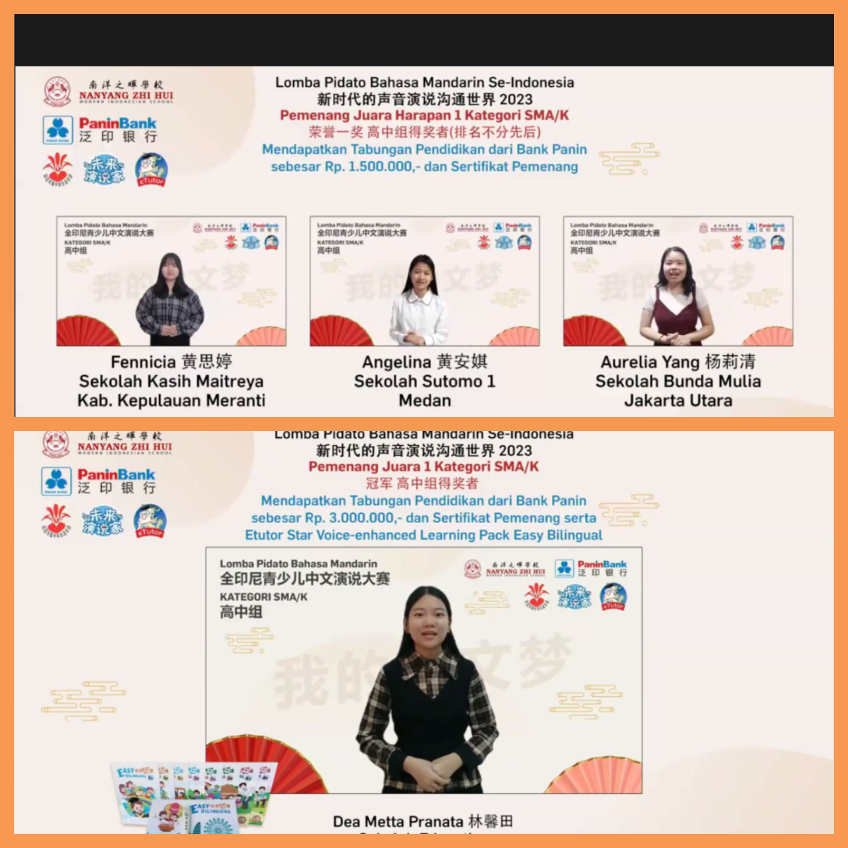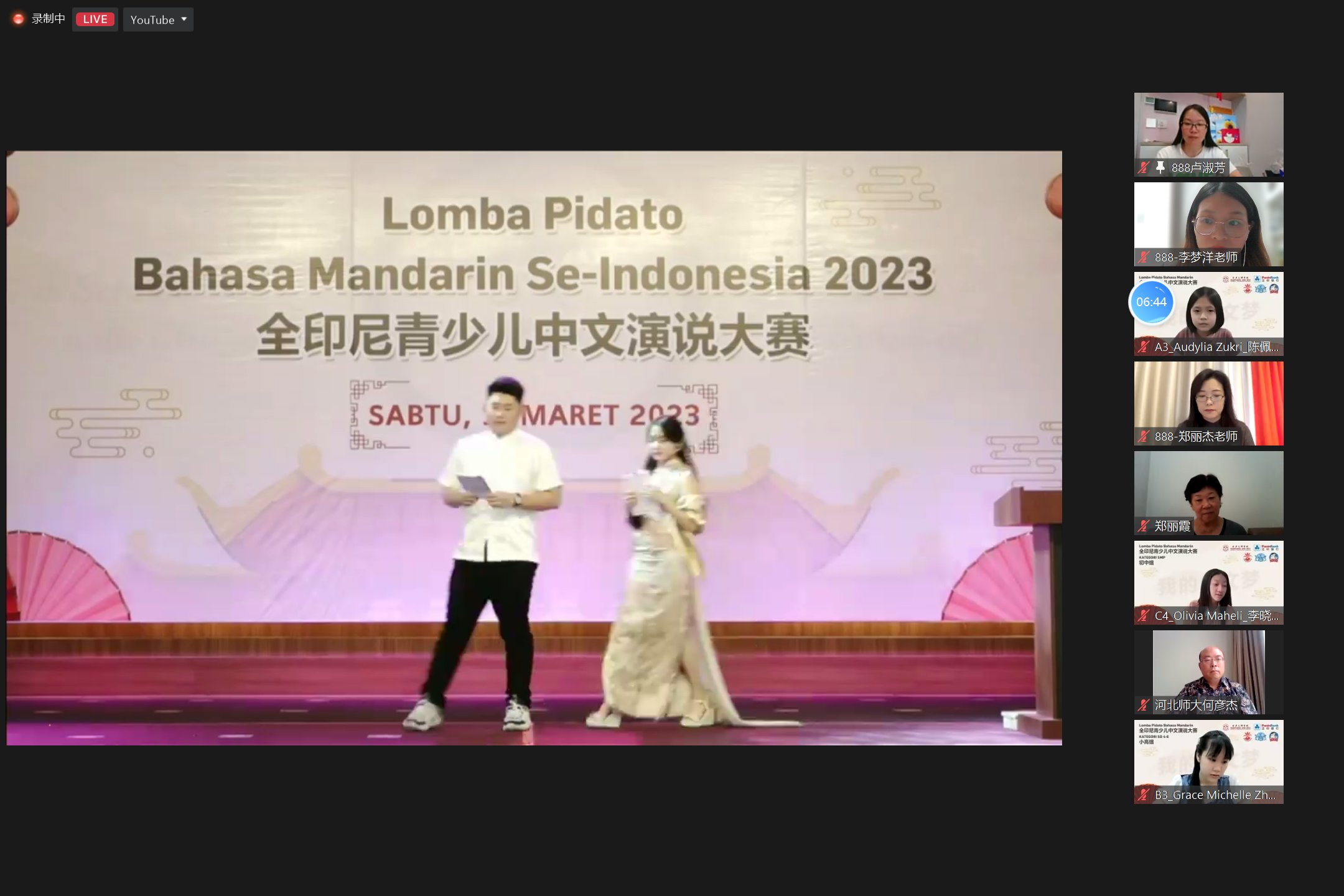 3月11日,由印度尼西亚中华乐趣学苑主办的“2023全印尼青少儿中文演说比赛”闭幕式及颁奖典礼在印尼棉兰南洋之晖中文学校落下帷幕。本次参赛选手共有670名,57名同学获奖。参赛选手中有52名同学参加了我院国际中文教学团队朗诵教学组开设的《华文鉴赏与诵读》课,在这52名同学里,林馨田获得高中组冠军,张芯倩获得小高组季军。方琬棋、陈俊成获得小低组一等奖,洪梓杰获得小低组二等奖,许嘉欣获得小低组三等奖;周金酆获得小高组一等奖,刘意田获得小高组二等奖;杨莉清获得高中组一等奖,陈敏获得高中组三等奖。
