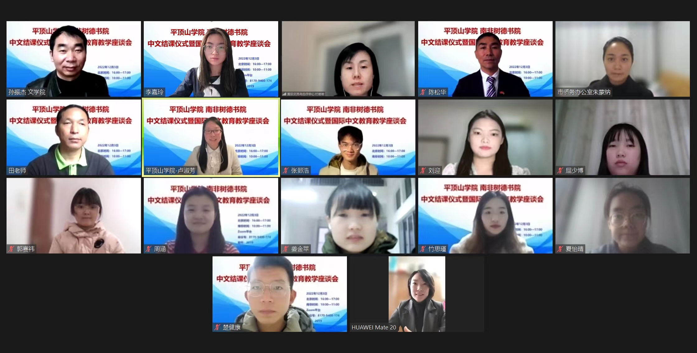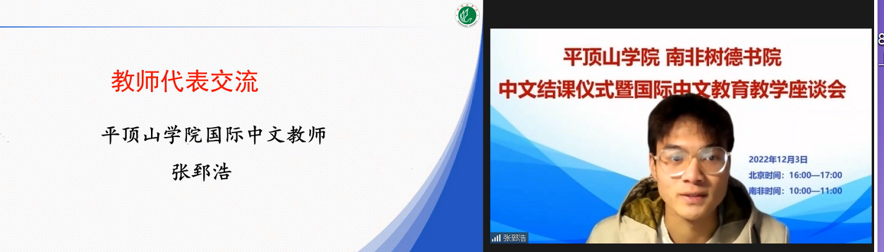 北京时间12月3日下午,南非树德书院中文结课仪式暨国际中文教育教学座谈会在zoom平台举行。南非夸纳省华文教育基金会主席、树德书院校长陈松华,南非树德书院教师代表田红星,平顶山市台联副会长付致远,平顶山市人民政府侨务办公室侨务科四级主任科员朱蒙纳,平顶山学院国际交流与合作中心主任付岩岩,文学院语言教研室主任卢淑芳和国际中文教育团队成员出席此次会议。会议由文学院院长孙振杰主持。