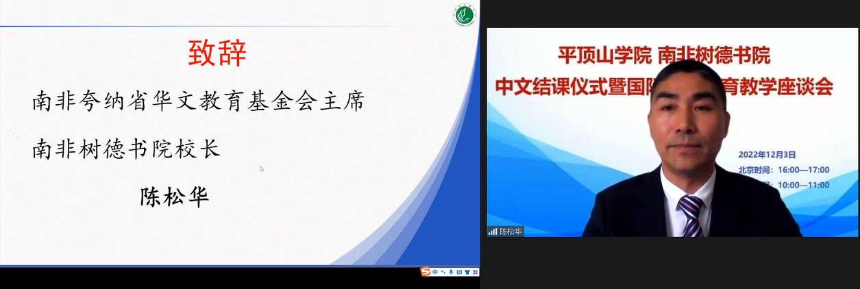 陈松华在致辞中对平顶山学院及平顶山市侨办的各位领导老师所提供的国际中文课程教学深表感谢。他指出,突如其来的疫情对非洲华侨华人的生产生活造成极大的影响,南非树德书院面临生源锐减、办学经费不足、师资匮乏的困境。关键时刻,平顶山市侨办联合平顶山学院组建优质国际中文教育教学团队雪中送炭,帮助南非树德书院开展丰富多彩的线上中文教学活动,使南非树德书院的华文教育得以顺利开展并稳步前进。陈松华对平顶山学院国际中文教育教学团队表示衷心的感谢,对中文教学成果给予极大的肯定。