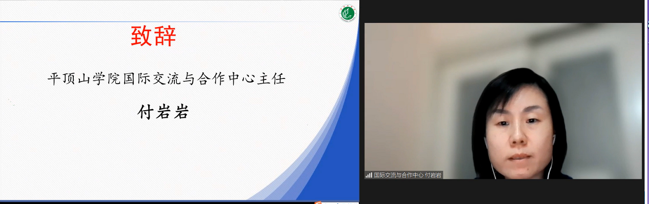 付岩岩在座谈会上致辞。她向参加学习的全体学员们表示衷心的祝贺,向为此项目付出心力的全体师生们表示诚挚的感谢。她指出,受疫情影响,学员们远隔千里进行线上学习,虽然困难重重,但是平顶山学院师生团队仍然用最严格的标准来要求学生,打造了有趣又有料的线上中文课堂,教学效果远远超出预期。付岩岩还特别提到平顶山学院文学院先后成功承办了教育部“汉语桥”线上团组交流项目、国侨办“中华文化大乐园-欧洲园”活动,指出文学院国际中文教育教学团队不忘初心,厚植国家情怀,在传播中华传统文化上,不遗余力,纵横千里。她表示平顶山学院将以此次活动为契机,充分发挥平顶山市华文教育基地的资源优势,积极探索华文教育的新模式、新方法和新途径。