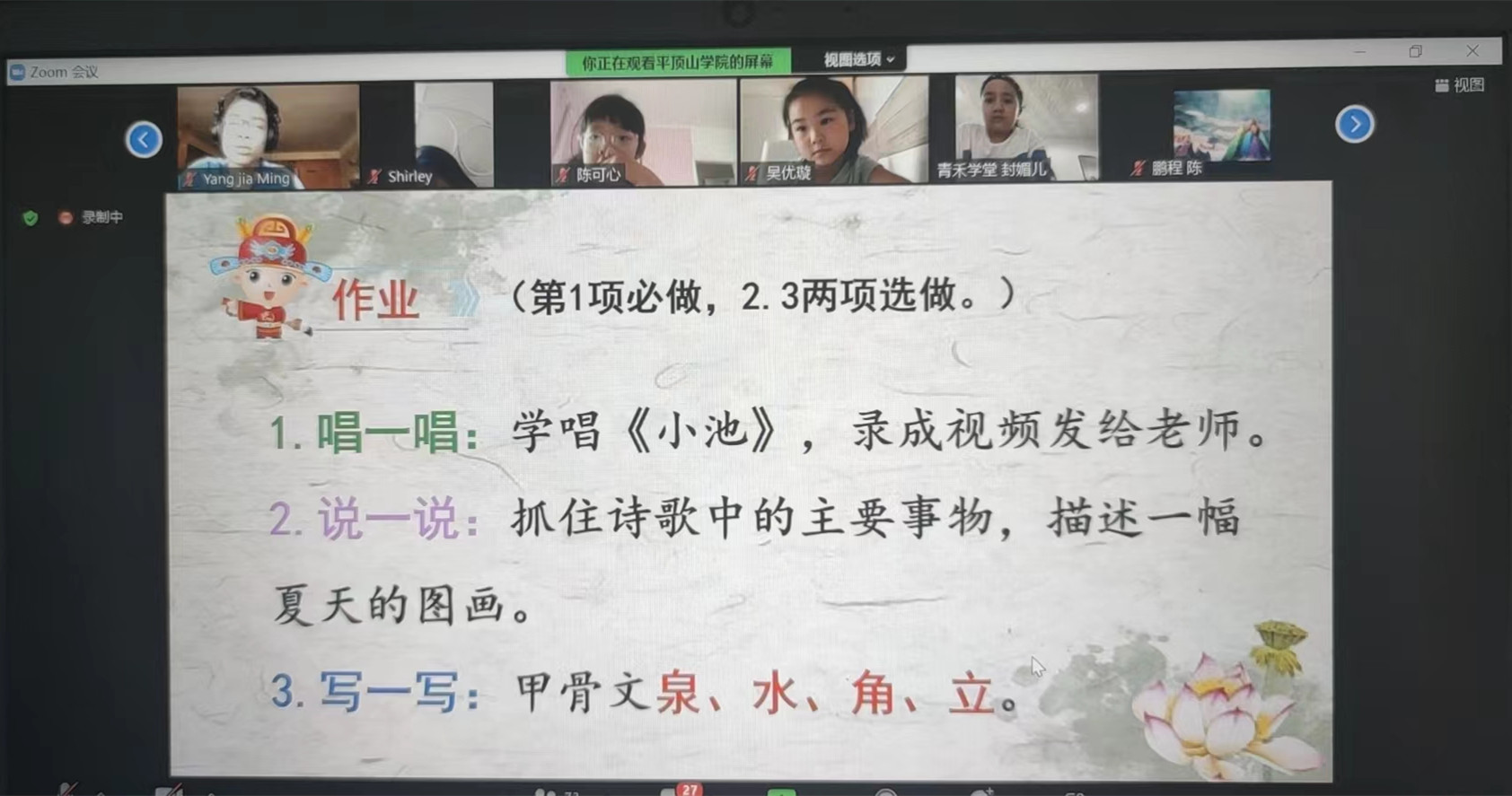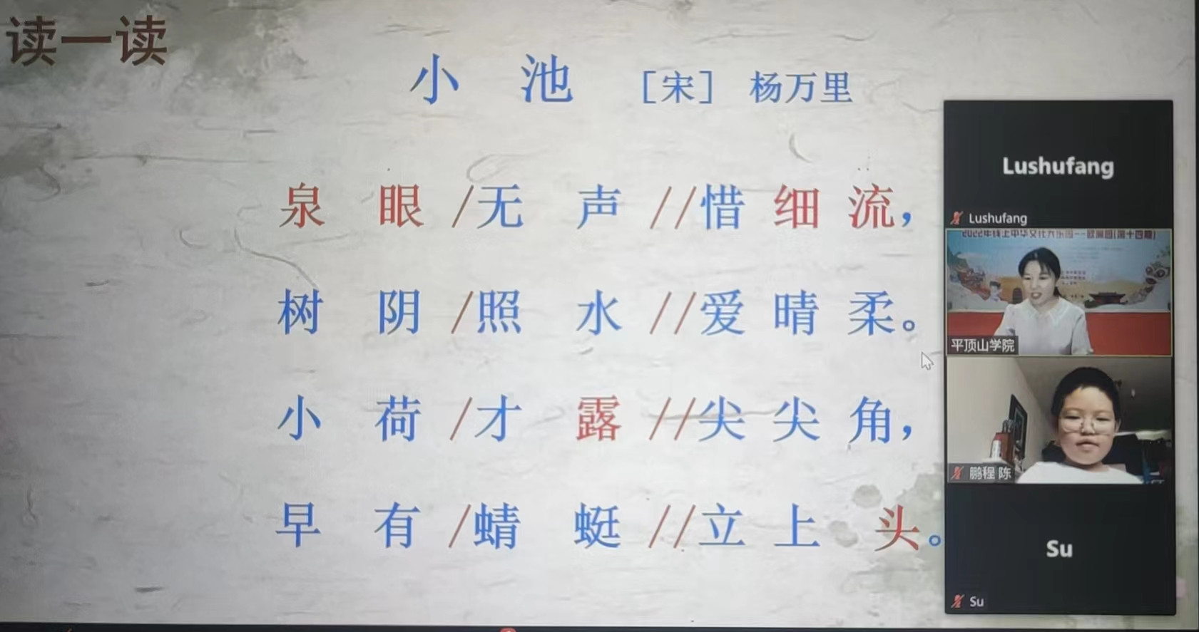 古典诗歌,可吟唱可读诵,是学习中文和了解中国文化的重要载体。在“唱古诗学中文”课程中,文学院教师刘亚科、王惠带领大家学习了南宋诗人杨万里的《小池》、朱熹的《观书有感》和唐代诗人李白的《春夜洛城闻笛》。为了达成“学会一首歌”的教学目标,每次上课,助教老师都会带领同学们吟唱这三首诗,授课教师会为大家细细讲解诗歌的意义和蕴含的哲理思想。学员们有的跟着节奏习唱,有的针对自己的疑惑抢麦提问,课堂气氛异常活跃,互动环节井然有序。《观书有感》诗中的“半亩方塘一鉴开”,“鉴”是镜子的意思,半亩大的池塘像镜子一样清澈透明,以至于水中闪耀着蓝天白云,情态毕见;“问渠哪得清如许,为有源头活水来”,“方塘”因有“源头活水”的不断输入,所以永不枯竭,永不陈腐,永不污浊,永远“深”而且“清”,也告诫人们要不断接受新事物,多读书,才能保持思想的活跃与进步。这就是中国古典诗歌引人注目的一点,诗歌作为一种感性的形象本身,它还蕴涵着一种理性的哲理,富有韵味。