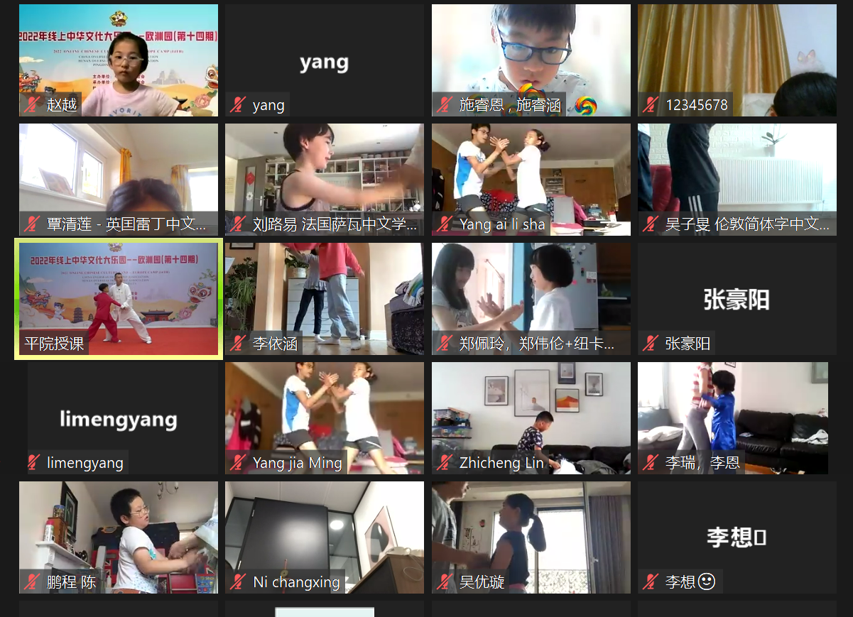 北京时间7月29日至8月1日,按照既定计划,2022年线上中华文化大乐园——欧洲园课程陆续开课。主办方开设了“唱古诗学中文”“少林‘三宝’学功夫”“水墨中国:中国画”“亲子太极拳”等课程,教师们采用“实时授课+远程指导+隔空实践+云上互助”的方式,与来自英国、法国、捷克、德国、科威特等国的400余名华裔青少年一起感受中国传统文化的魅力。