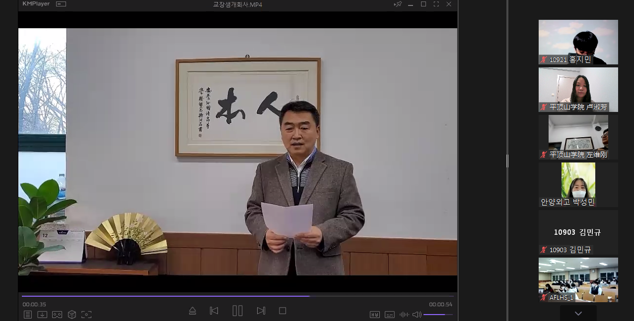 北京时间12月20日18时整,“韩风汉韵 青年互通”中韩文化线上交流会在文学院1322会议室举行。韩国安养外国语高中(以下简称安养外高)校长李享根、汉语部教师朴成敏,平顶山学院国际交流与合作中心主任付岩岩、文学院院长孙振杰出席交流会,韩国安养外国语高中学生,平顶山学院文学院汉语国际教育专业师生近百人参加了线上交流。交流会由文学院2019级汉语国际教育专业、戏剧影视文学专业学生郭文君、王帅辉主持。