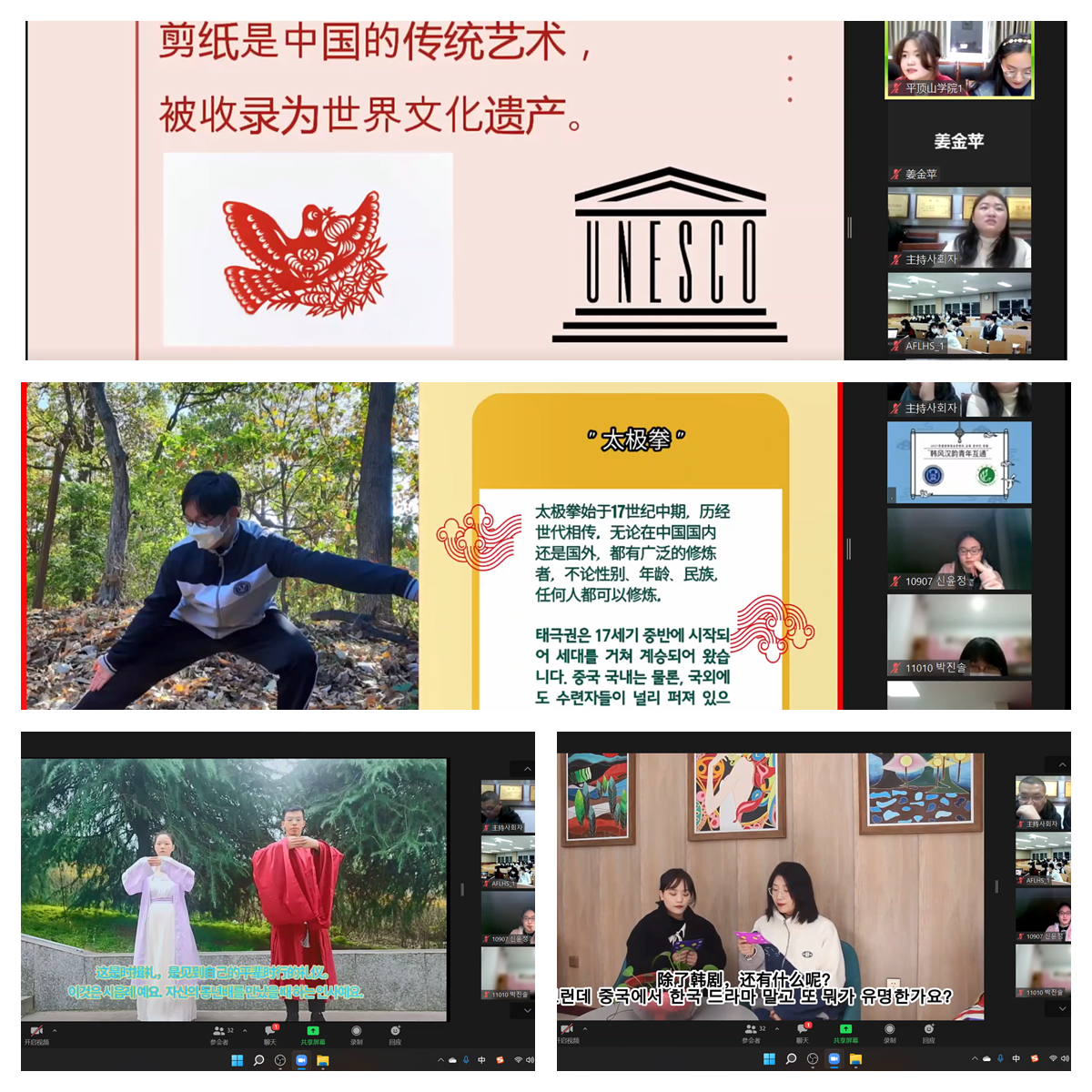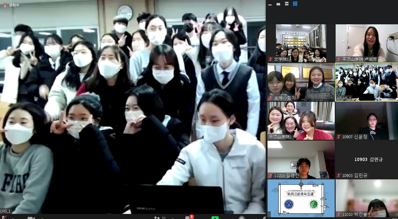 汉韵韩风交相辉映,语言文化相得益彰。近两个小时的线上交流会,中韩两校青年积极互动,观看了双方学校的宣传片,播放了各自精心准备的课程视频。《五禽戏》《颐和园》《桂林》《土掌房》等视频讲述了安养外高的韩国学生通过学习汉语了解中国、感受中国文化的点点滴滴。介绍中国“雅乐”、中国女性传统服饰文化、中国传统相见礼、中国人眼中的韩国流行文化等主题的视频,也是内容丰富,精彩纷呈。互动环节中,中韩学生就双方感兴趣的中国婚俗、中国人喜好红色的原因、汉语朗读技巧、中国的移动支付手段、韩国人眼中的中国印象、韩国人最喜欢的中国美食等问题进行了详细解答。交流会现场还进行了优秀作品评选和颁奖,文学院语言教研室主任卢淑芳宣读了安养外高获奖学生名单。