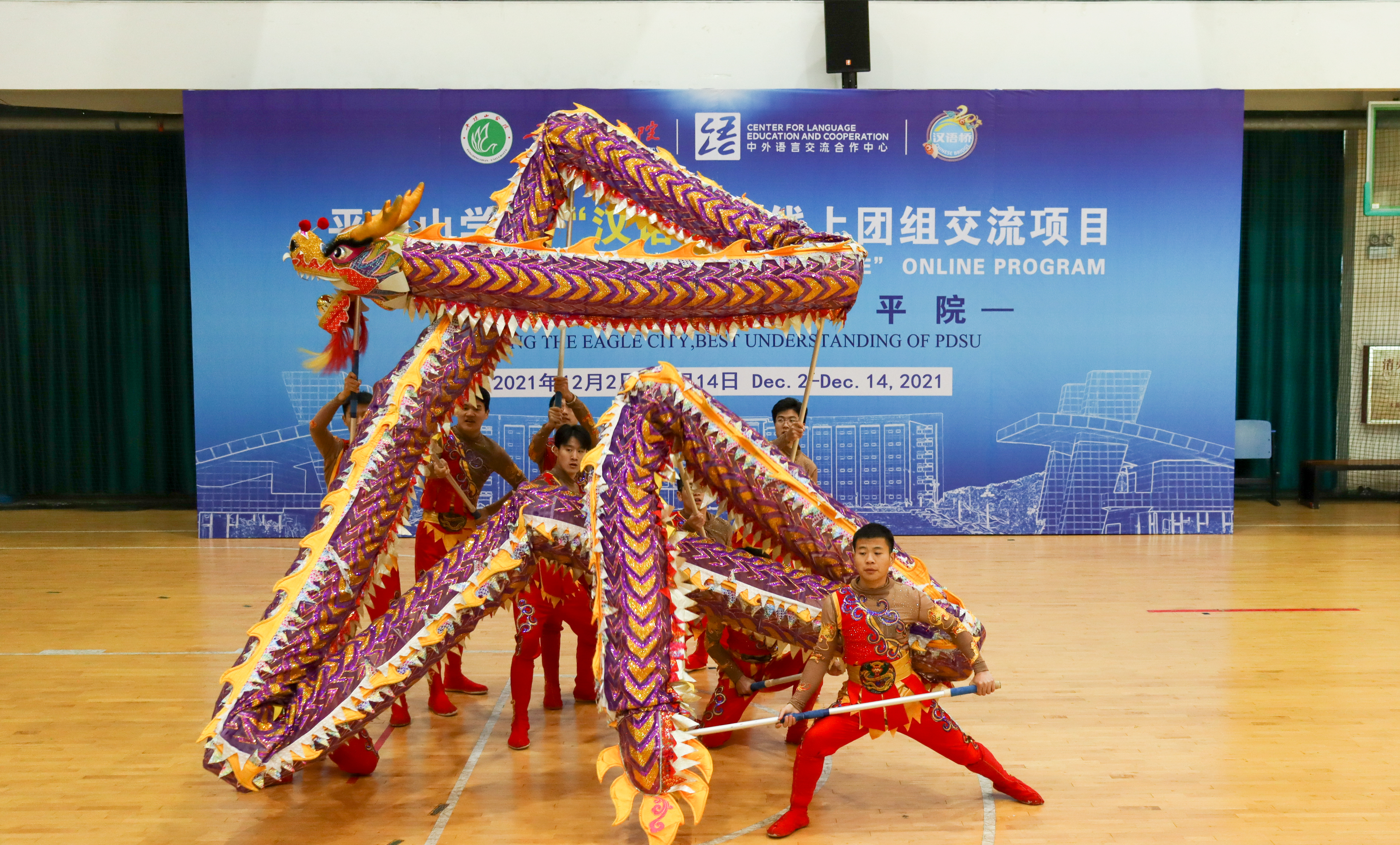 2021“汉语桥——豫见鹰城,感知平院”线上团组交流项目为期14天,依托平顶山学院国际中文教育与中原地域文化特色,聚焦学校特色文化,组织了实力雄厚的授课团队,精心设计了内容丰富、形式多样的中文语言课和文化体验课,采用“直播授课+文化体验+录播视频”相结合的方式,为美国学生提供学习中文、感受和体验龙狮文化、武术文化、陶瓷文化、雅乐文化、茶文化等中原文化的平台。