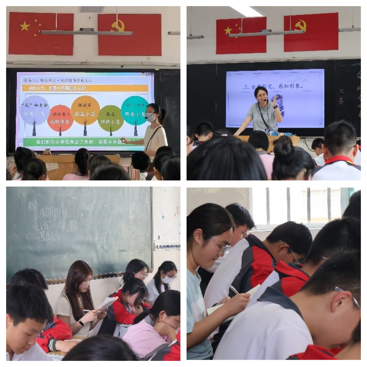 九中语文组的七位教师通过师生讨论、小组互动、课堂交流等探究式学习策略引导学生深入课堂,充分发挥了学生的主体性。在《驿路梨花》第二课时,杨老师带领学生回顾课文中的重点词汇,梳理了有关“茅屋主人”的三个悬念,巧妙地将插叙的作用和题目的含义等技巧性知识融入课文讲解,让学生通过完成习题及时巩固知识。这一安排既能让学生摆脱传统教学中习得答题技巧所产生的无趣性,又能让学生把对课文内容的理解上升到对作文写作手法的领悟,实现了知识学习和能力掌握的同步提升。在《台阶》这节课中,教师运用问题导向的原则,给各小组分别安排不同的讨论任务,将分工进一步明细化,学生聚焦问题发散思维,在交流探讨中细读文本,不仅有助于加深对课文内容的理解,同时还锻炼了团队合作和沟通表达的能力,积累了宝贵的学习经验。