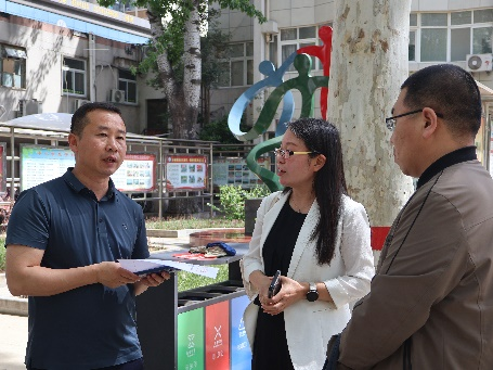 与九中办公室主任梅林沟通见习安排事宜(摄影/郑淑婷)