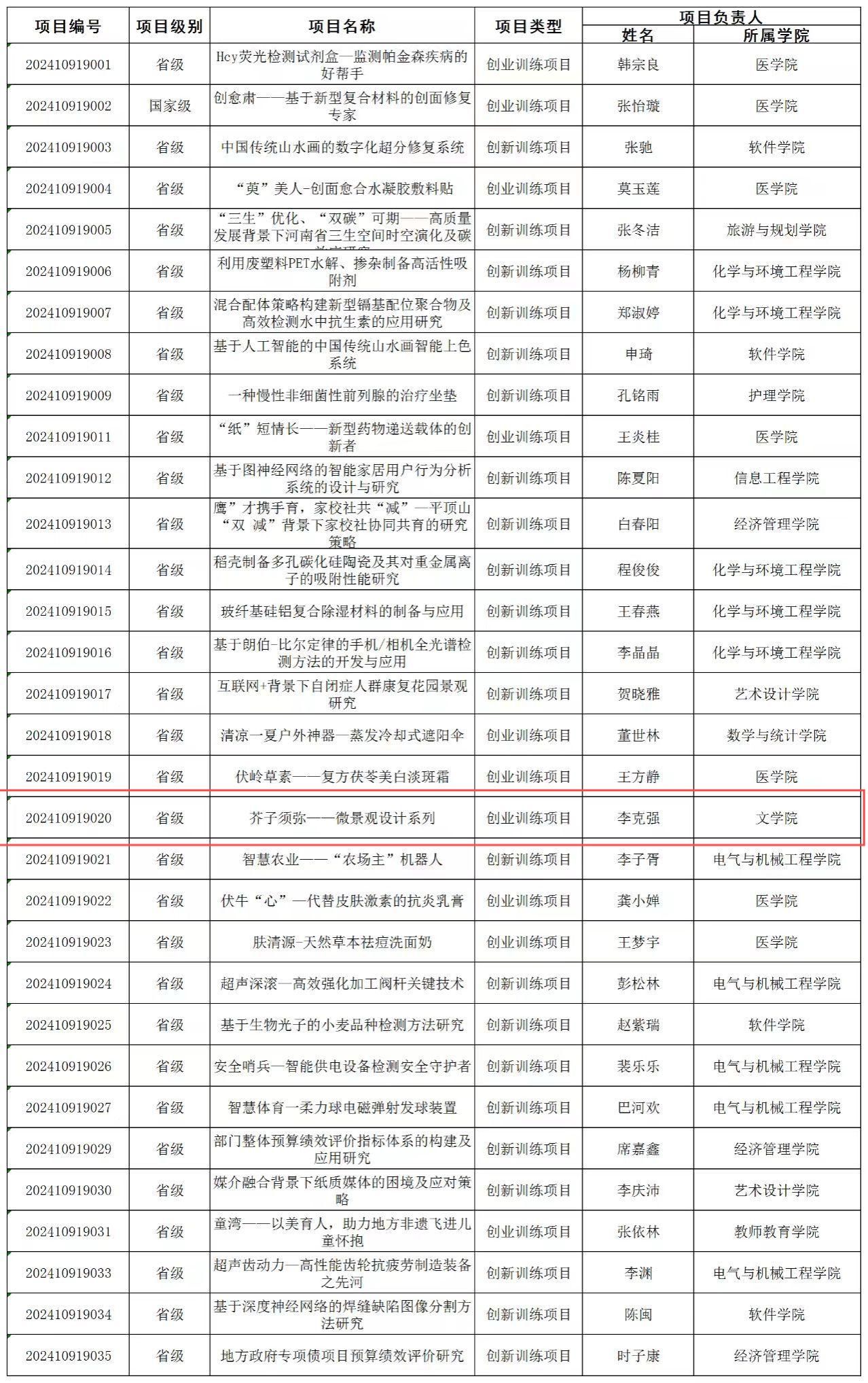 近日,河南省教育厅印发了《关于公布 2024 年大学生创新训练计划项目名单和结题验收结果的通知》(教办高〔2024〕376 号),我校32个大学生创新创业训练计划项目获批立项,其中,我院2022级汉语言文学专业学生李克强主持的《芥子须弥——微景观设计系列》获批省级立项。