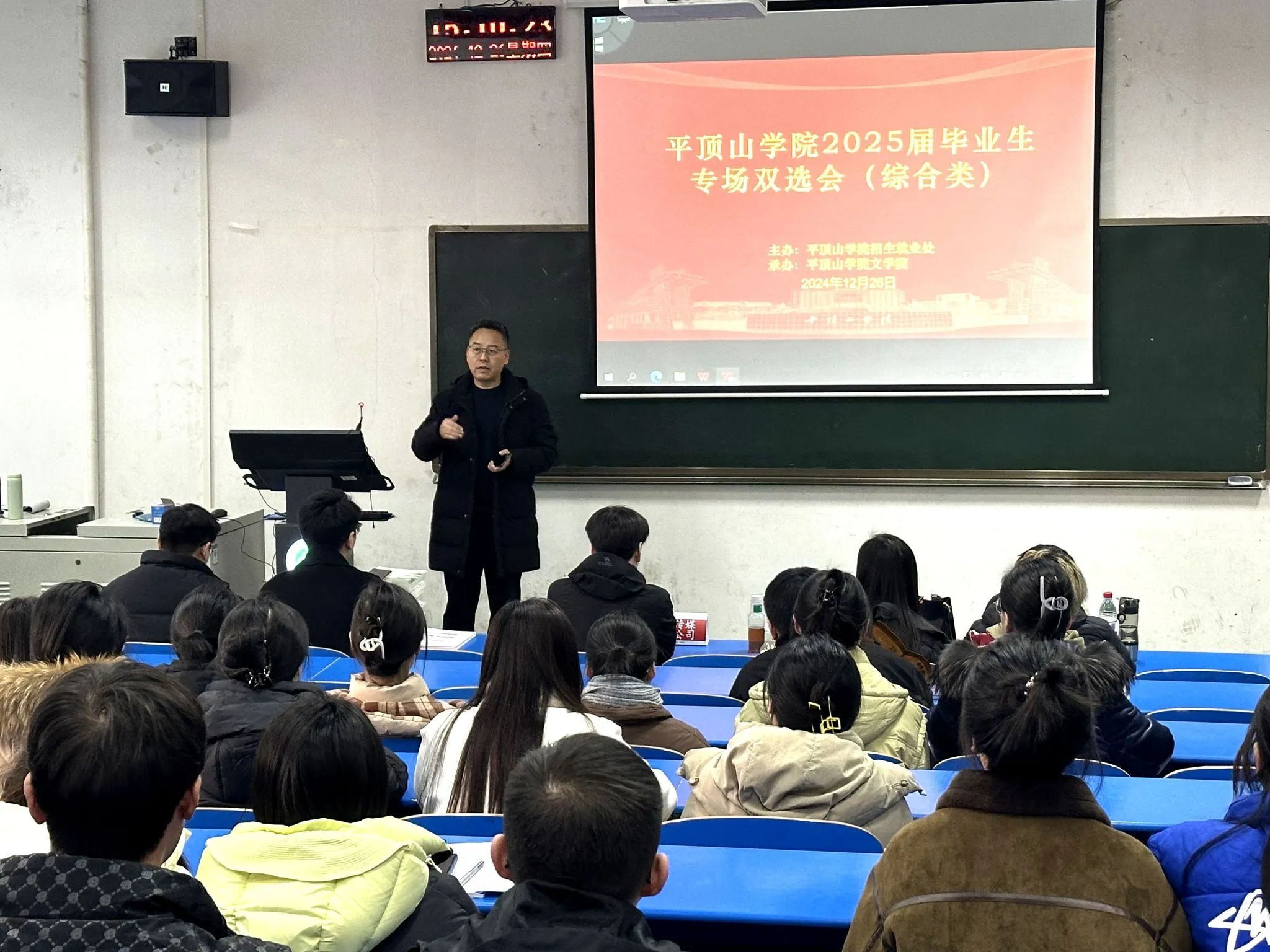 12月26日下午,我校在一号楼1206教室举办2025届毕业生研后综合类专场双选会。本次双选会由招生就业处主办,文学院承办,招生就业处和文学院相关负责人到现场进行指导,各学院2025届毕业生及部分低年级学生参加招聘活动。