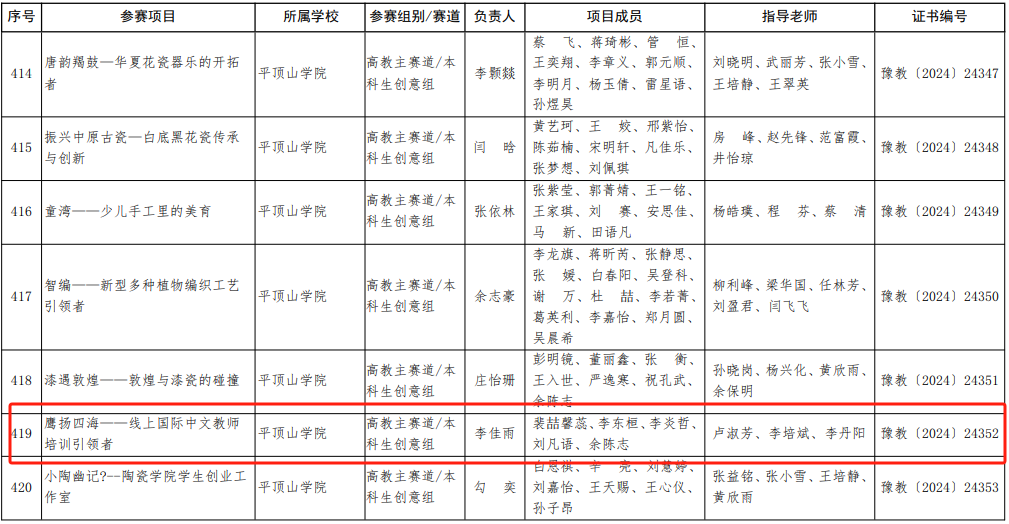 近日,河南省教育厅公布了2024年河南省大学生创新大赛暨中国国际大学生创新大赛河南赛区选拔赛获奖名单,由我院卢淑芳,李培斌,李丹阳老师指导,青鸢国际中文教育团队学生李佳雨主持的项目《鹰扬四海——线上国际中文教师培训引领者》获三等奖。