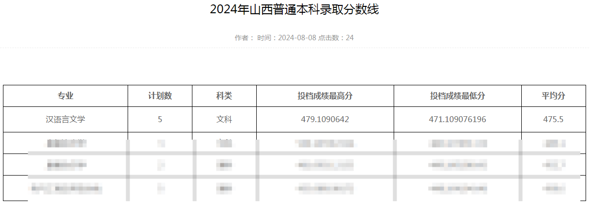 文学院2024年山西普通本科录取分数线