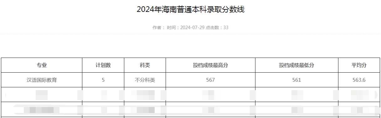 文学院2024年海南普通本科录取分数线