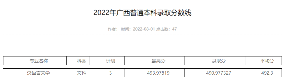 文学院2022年广西普通本科录取分数线
