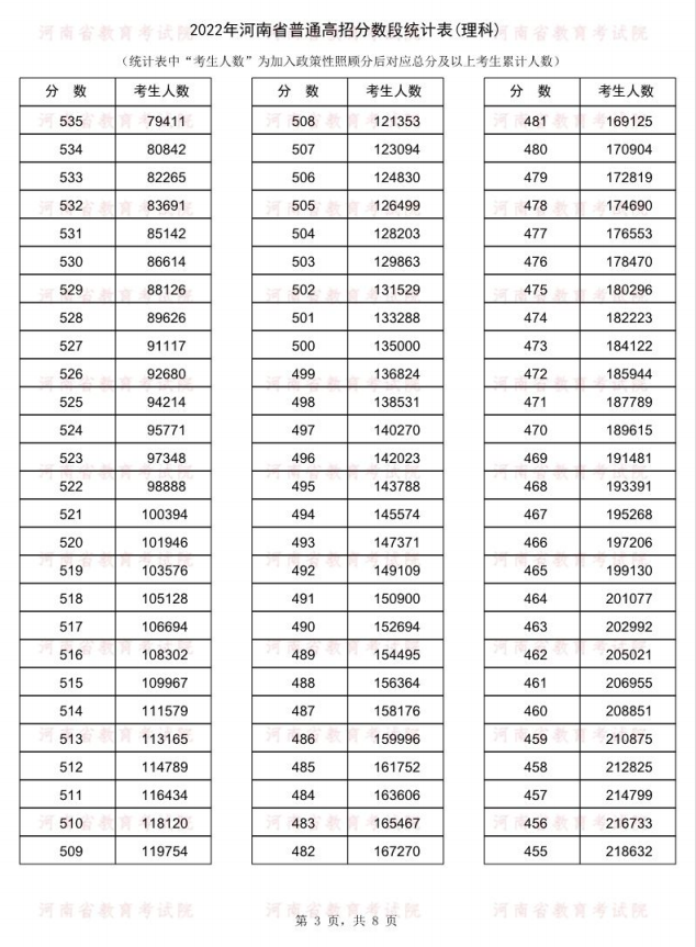 2022年河南省普通高招分数段统计表(理科,完整统计请在附件中下载)