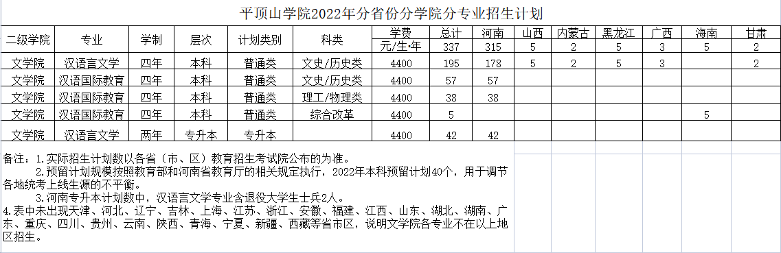 平顶山学院2022年分省份分专业招生计划(文学院)