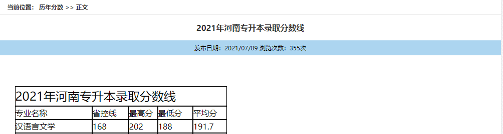 文学院2021年专升本录取分数线