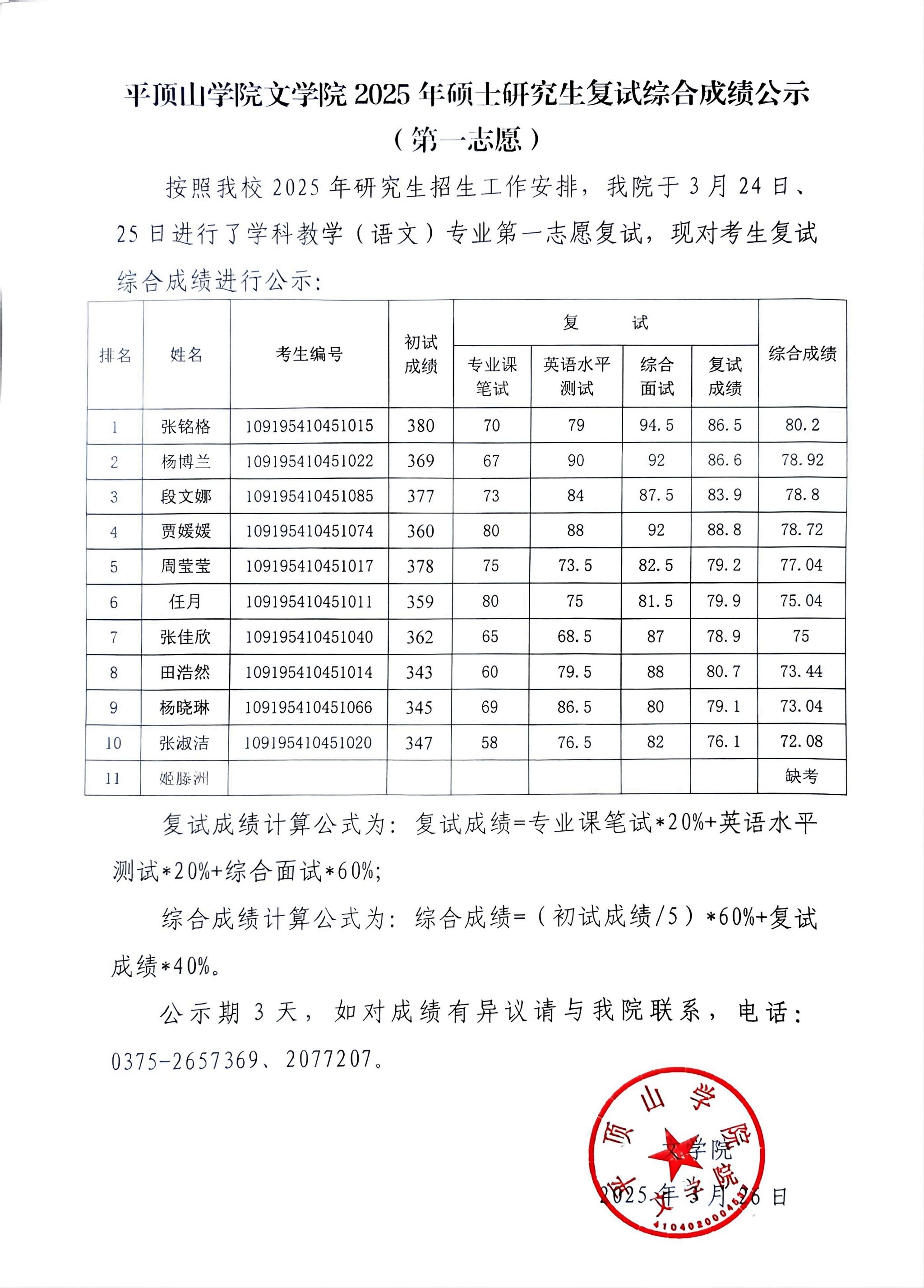 平顶山学院文学院2025年硕士研究生复试综合成绩公示(第一志愿)