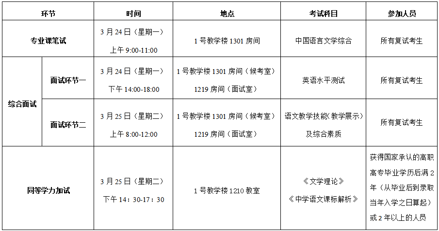 专业笔试考核中国古代文学、现代汉语知识应用能力和问题分析能力。综合面试,分为两个环节;面试环节一:考核英语听、说、翻译能力;面试环节二:考核中学语文教育技能、综合素养。
