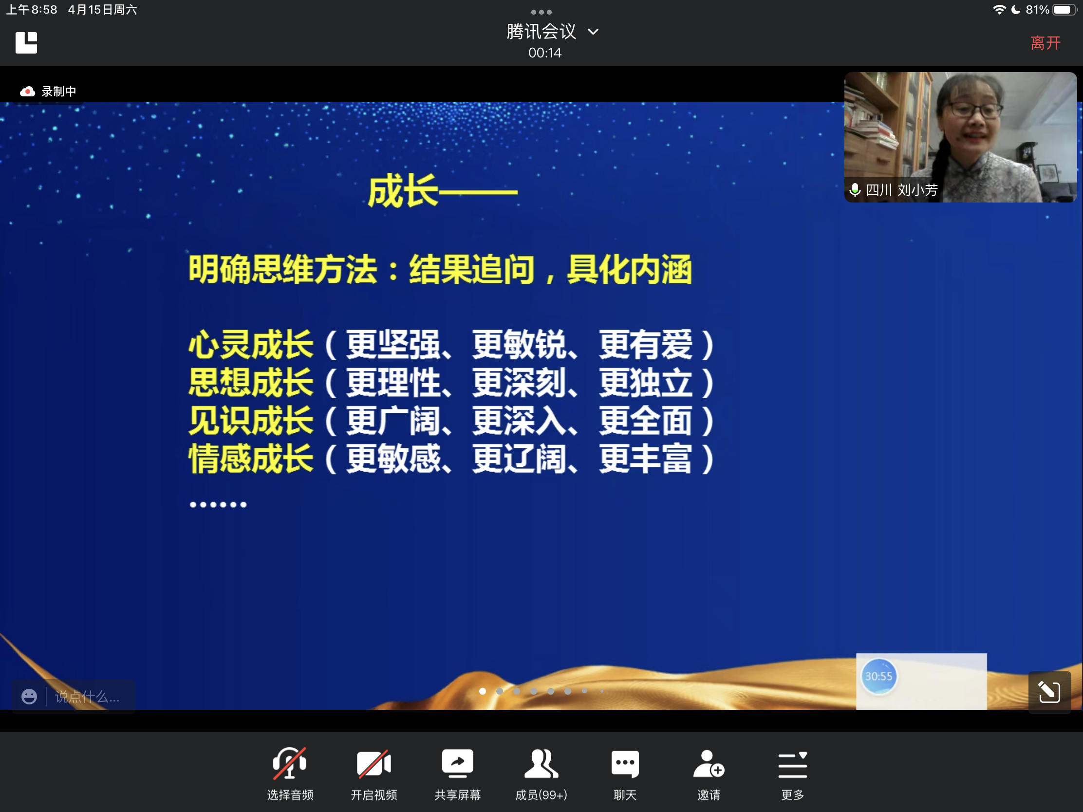 春风如贵客,一到便繁华。4月15日上午,全国语文教师教育研究中心会员、四川省双流中学语文教师刘小芳作题为《打开文学的心眼--中学作文出彩技巧》的线上报告,国培计划(2022)培训班班主任及学员50余人在我校崇文校区教室里集中收看。